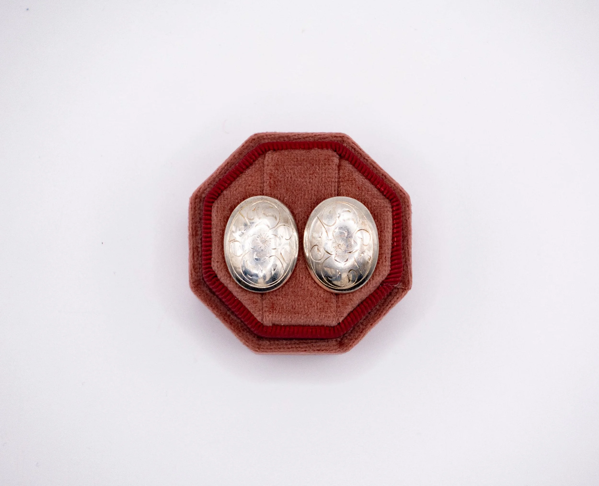 This is a lovely pair of 1940s to 1950s engraved sterling silver earrings! Each earring is hand engraved in the center with a beautiful cherry blossom, which is surrounded by a swirl design and engraved leaves. These earrings are very well made and have a great retro style design!