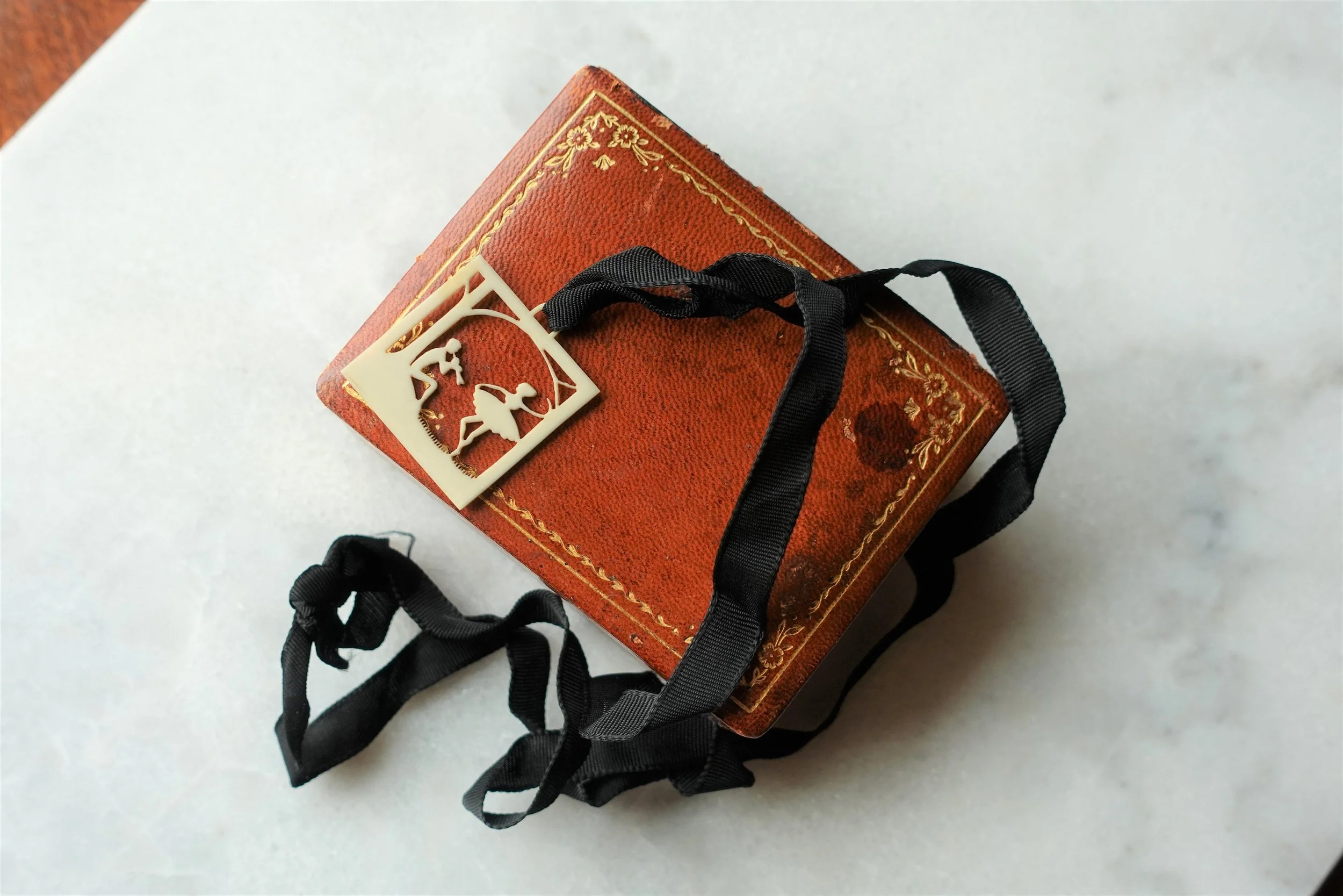 This is a really special antique piece in carved celluloid depicting the scene of a dancer and musician. It's very delicate and has a subtle yellow patina from age. I believe it is strung on it's original ribbon. The dimensions of the pendant are 3.2 cm x 3.6 cm.
