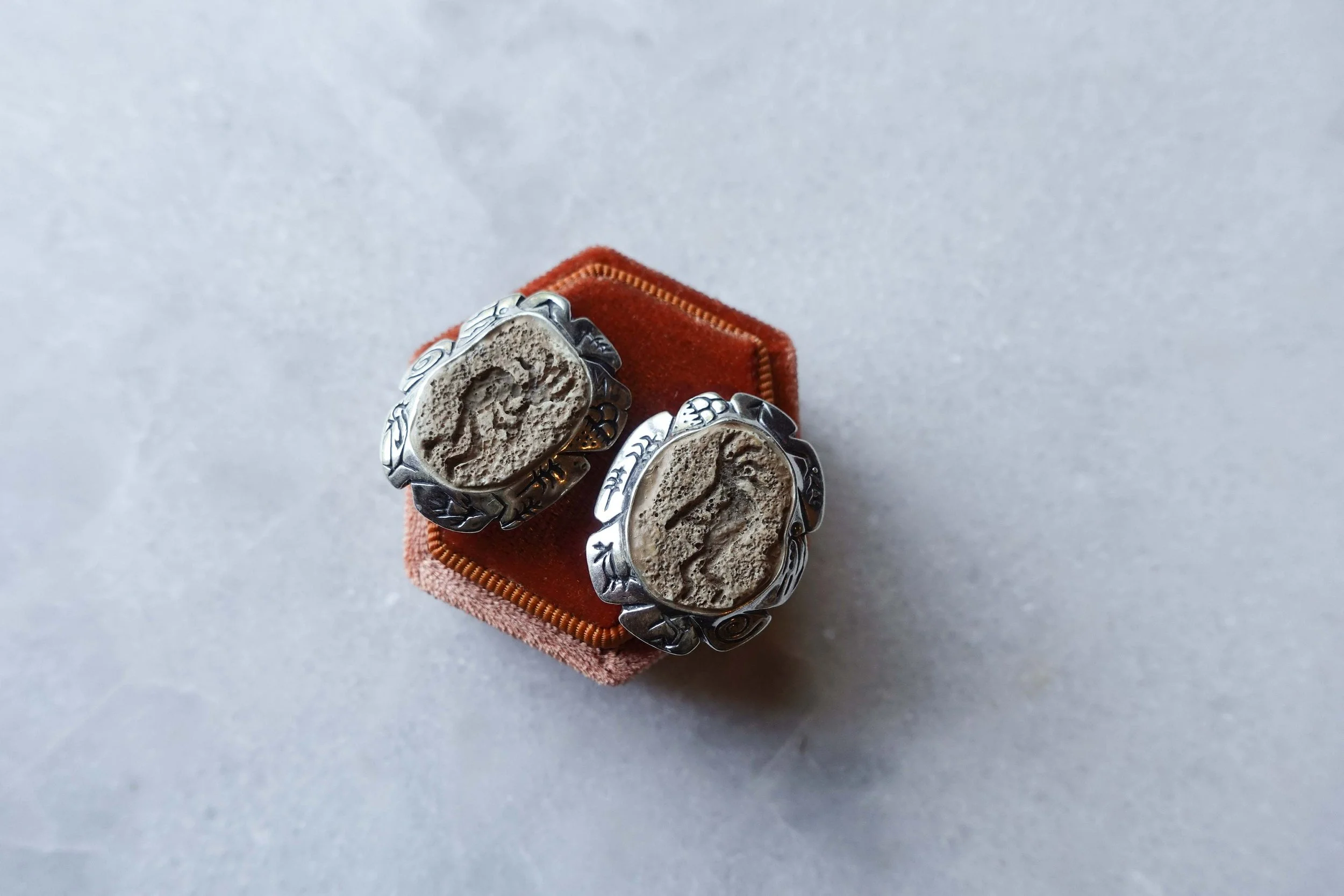A very unique pair of earrings with a lot of fantastic detail! The center of each earring is made in ceramic which imitates sandstone and gives the earrings an ancient look. The sterling silver bezels are engraved with beautiful Native American motifs and made in an organic shape that compliments the sandstone look very nicely.