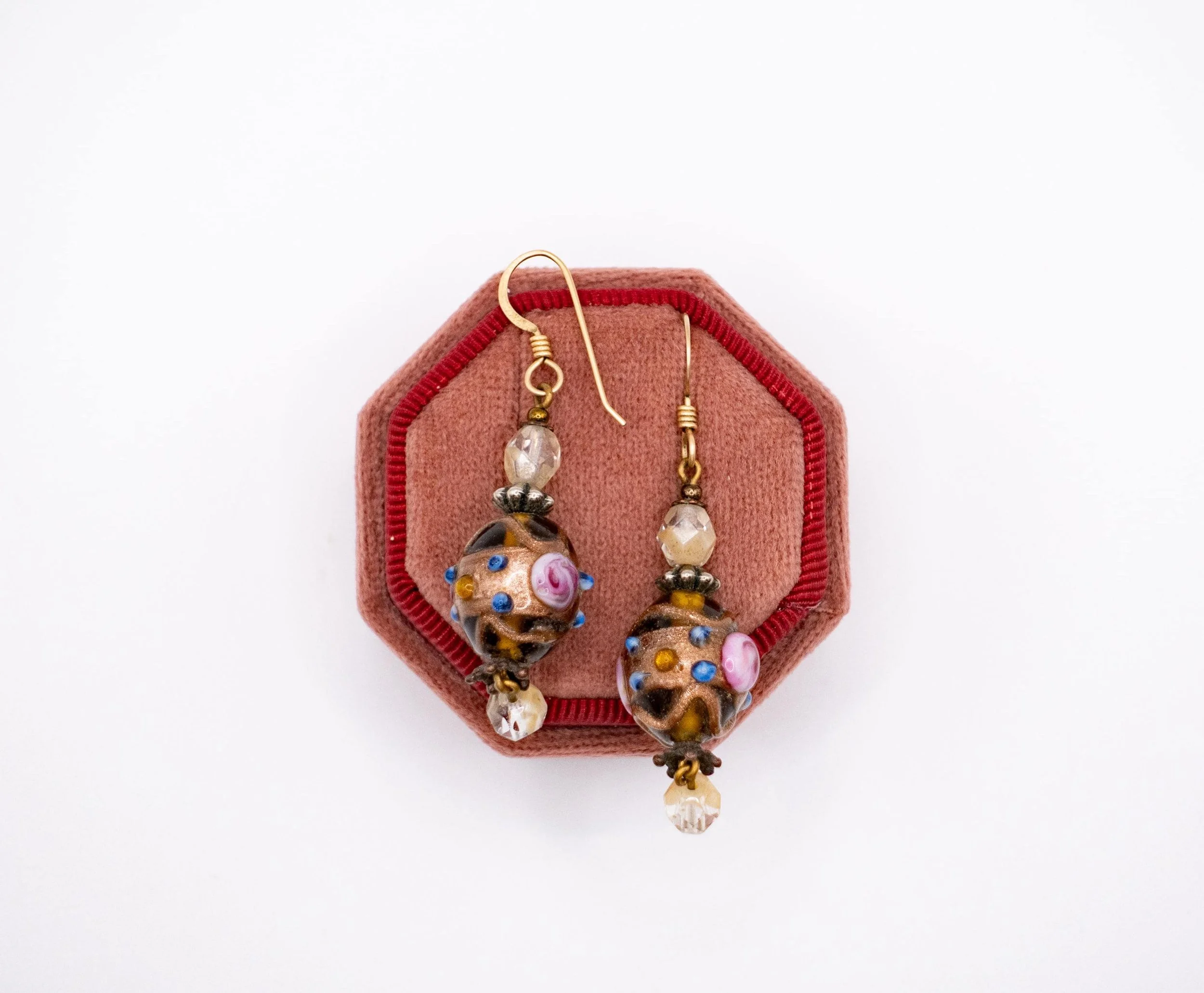 This is a very ornate pair of earrings featuring two gorgeous wedding cake beads! Each bead has beautiful details - a thread of shimmery bronze throughout the design, beautiful delicate pink roses formed in glass and little blue polka dots to complete the design. This is an amazing pair of vintage earrings which would complement a unique and eclectic look!