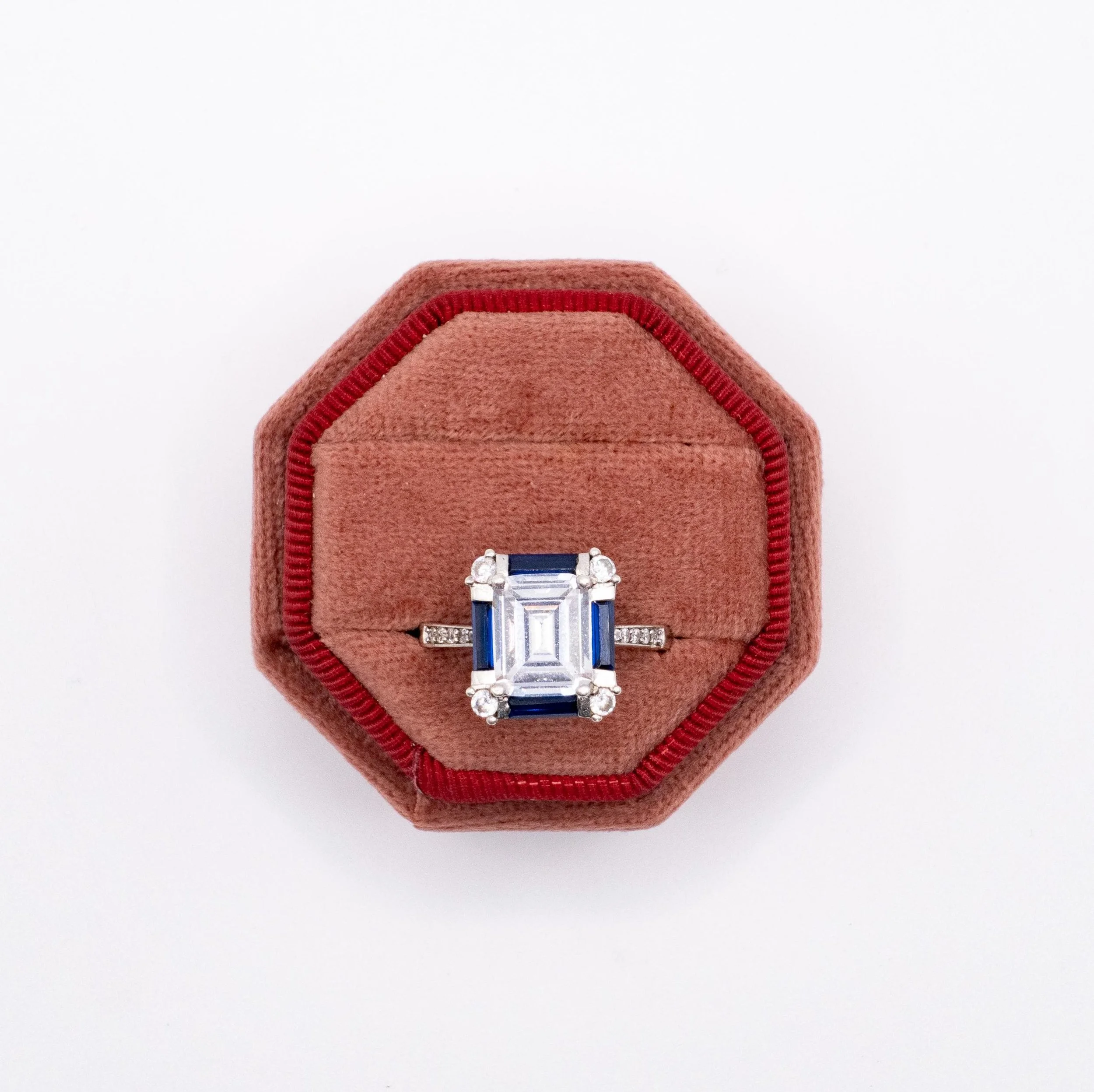 This is an incredible cocktail ring with an amazing Art Deco style design! It features a large emerald cut CZ in the center surrounded by dark blue synthetic sapphires. The band is also very pretty - it has pave set CZs with a lot of sparkle!