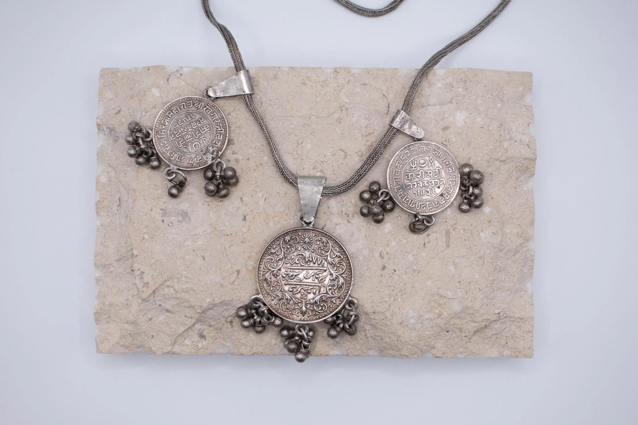 This is an incredible and rare solid sterling silver antique Indian coin necklace! These coins have some truly amazing beauty and detail and are in lovely antique condition. The coins are from the Princely State of Kutch, which was an independent state in India. The large coin is a 5 Kori piece dated 1884 during the reign of Khengariji III, in the name of Victoria. The small coins are a 1 Kori piece from the same time period dated 1882, and a 2 ½ Kori coin from the reign of Pragmalji II, also in the name of Victoria, dated 1875. The blockier text on all coins is Devanagari, and the more flowy/squiggly text is Urdu. This is an amazing necklace with outstanding workmanship and detail!