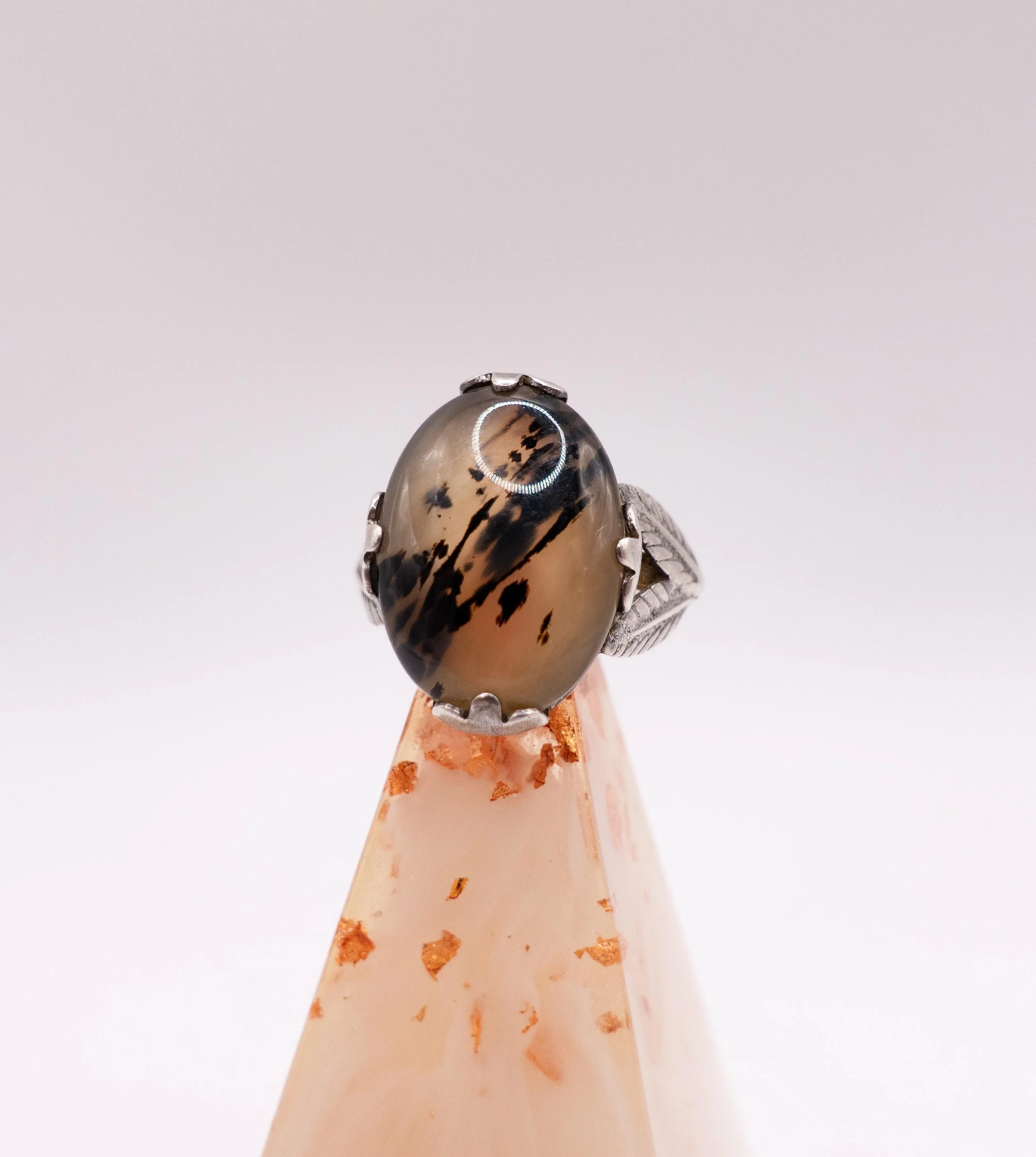 This is a delicate vintage agate ring circa 1940! The agate stone in the center has a lovely natural pattern of black and translucent stone, which is offset by flower shaped sterling prongs that hold it in place. The ring band also has a gorgeous design of delicate leaves which complements the center stone beautifully!