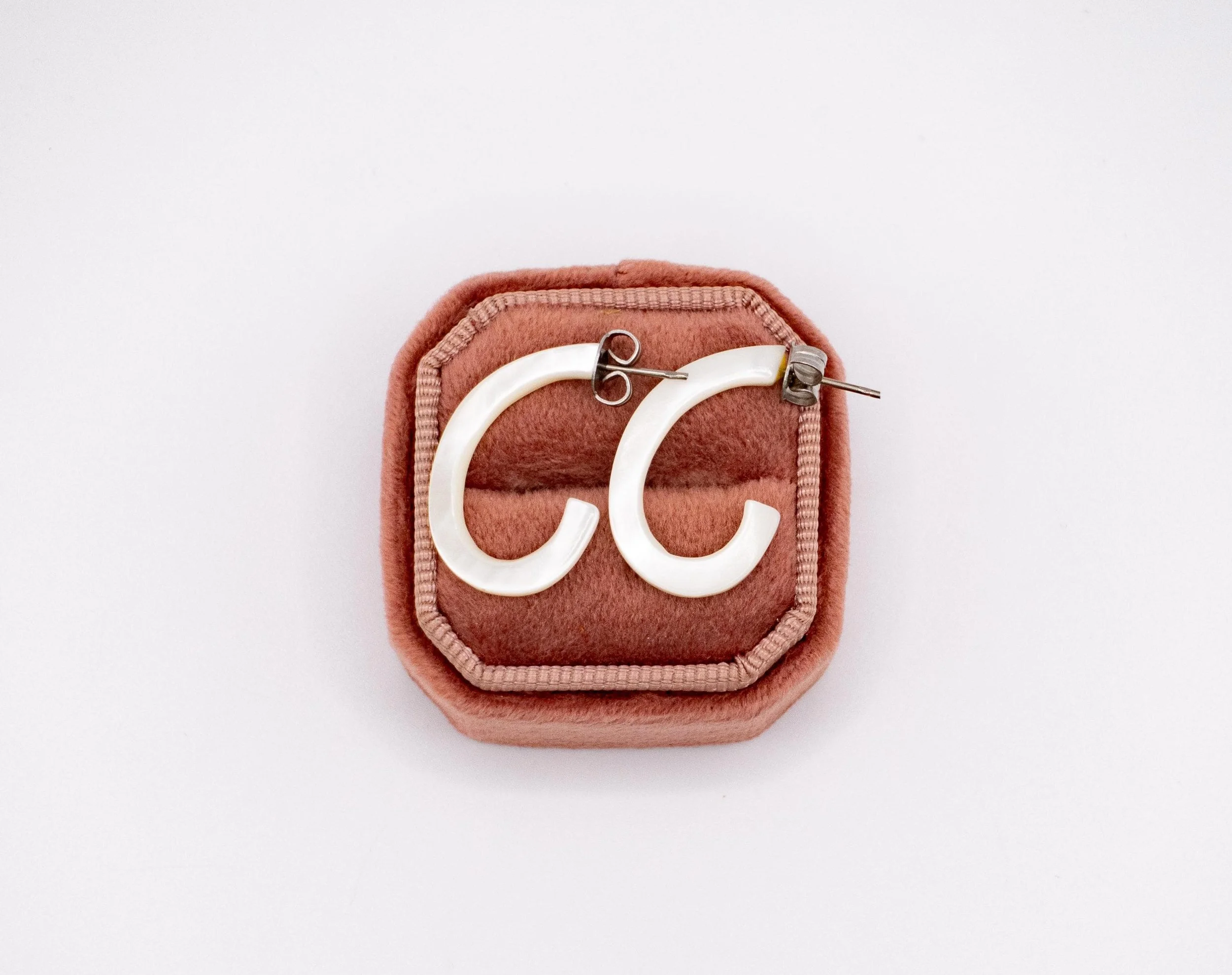 This is a wonderful simple and classic pair of carved mother of pearl hoop earrings! I've seen similar designs in resin, but never in mother of pearl. The earrings have a very nice oval shape, and are lightweight and comfortable to wear!